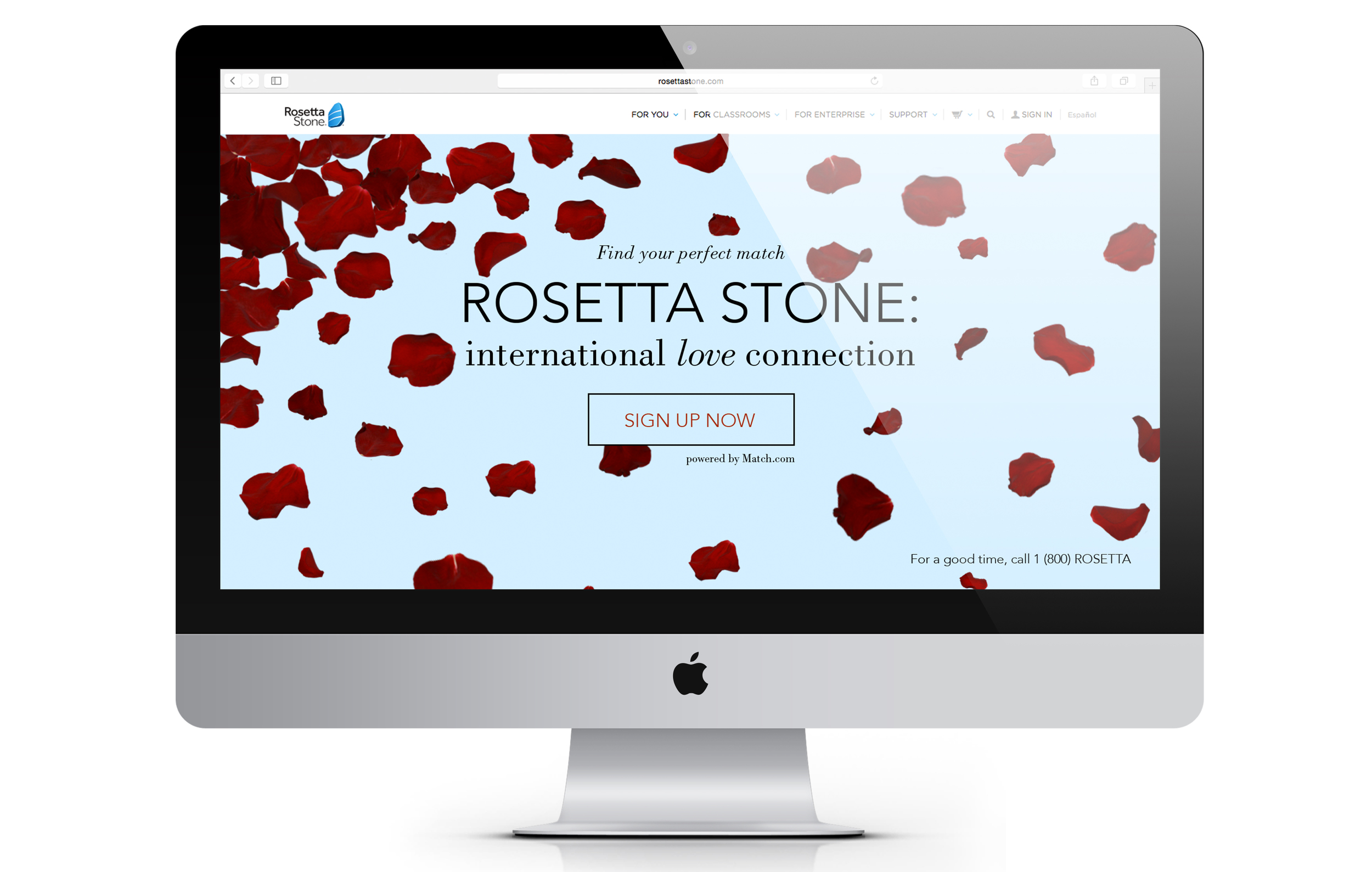 Rosetta Stone has partnered with Match.com to create an international love matchmaking service that connects people learning each others' languages. Web and social-based content lead people to this service on the the Rosetta Stone website and encourages them to learn the language of love, whatever language that may be to them.